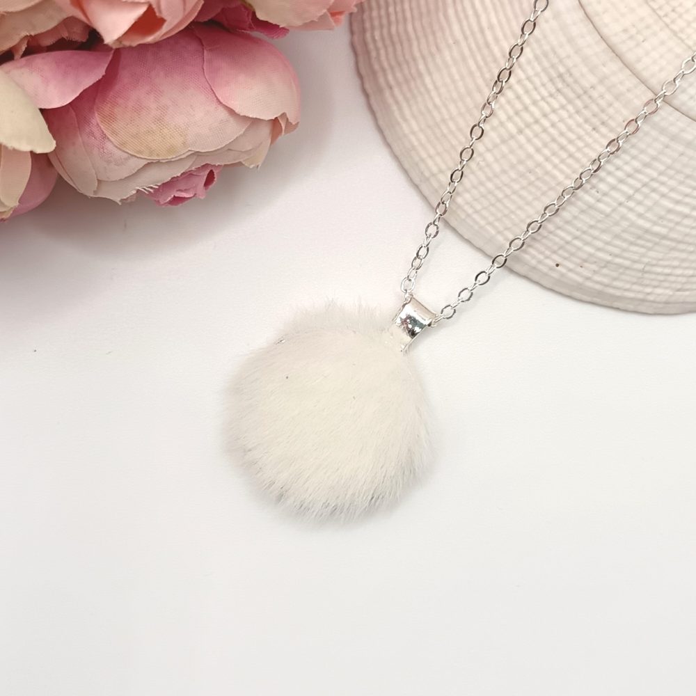 Az általam készített fehér színű ékszerek gyakran hordoznak játékos textúrákat is – például a képen látható hófehér pomponnal díszített nyaklánc. Ez az apró, puha díszítés egy kis melegséget és könnyedséget visz az ékszerbe, miközben megőrzi letisztult stílusát. A fehér itt nemcsak szín, hanem érzés: valami, amihez jó hozzányúlni, amit jó viselni.