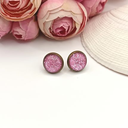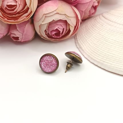 Antik bronz bedugós fülbevaló – rózsaszín csillogó textilbőrrel
