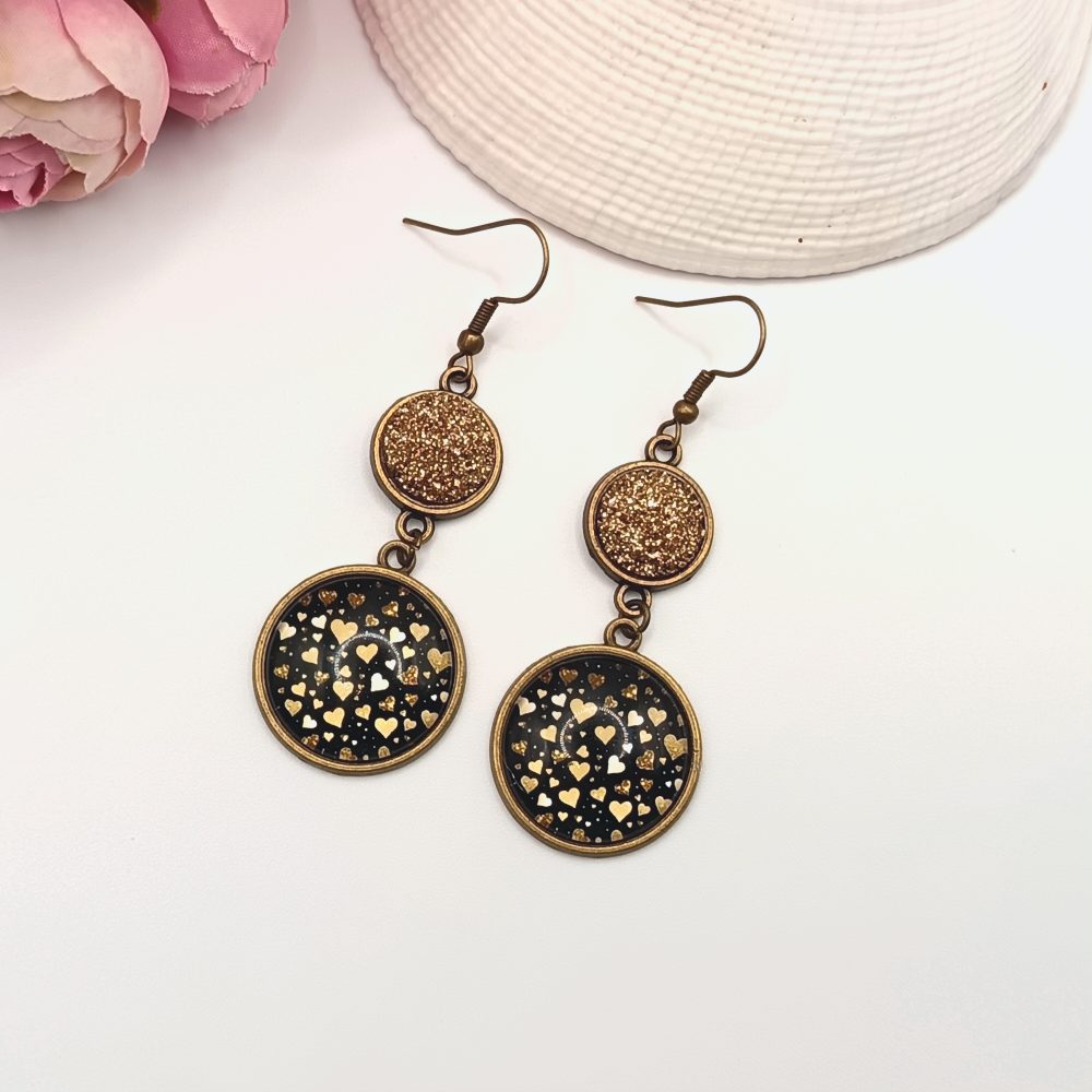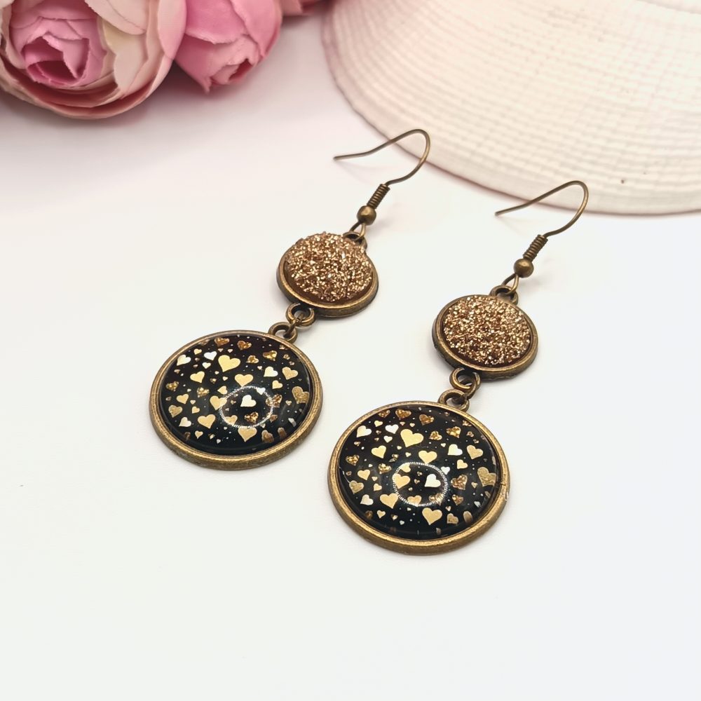 Kezdőlap Fülbevalók Akasztós fülbevaló Antik bronz akasztós fülbevaló – fekete, arany szívecskés lencsével