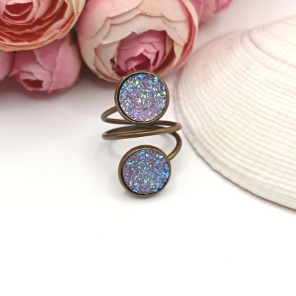 Antik bronz gyűrű – csillogó halványlila dupla lencsével 2000 Ft