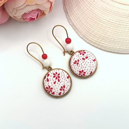 Antik bronz akasztós fülbevaló – fehér, piros virágmintás textil lencsével, fehér achát, piros korallkő ásványgyönggyel 2700 Ft
