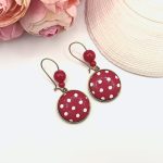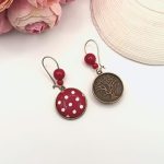 Kezdőlap Fülbevalók Akasztós fülbevaló Antik bronz akasztós fülbevaló – piros, fehér pöttyös textil lencsével, piros korallkő ásványgyönggyel