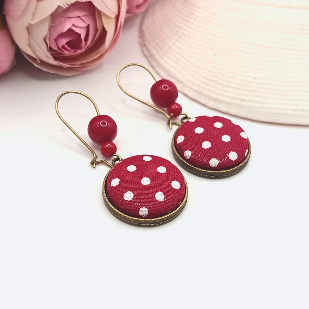Antik bronz akasztós fülbevaló – piros, fehér pöttyös textil lencsével, piros korallkő ásványgyönggyel