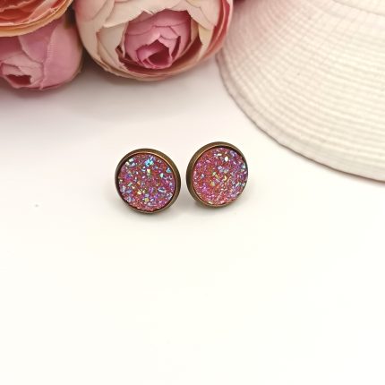 Antik bronz bedugós fülbevaló - csillogó rózsaszín lencsével 1100 Ft