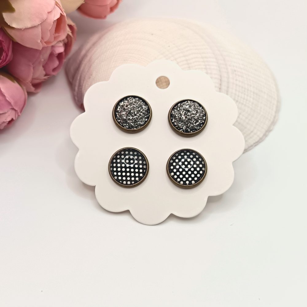 Kezdőlap Fülbevalók Bedugós fülbevaló Páros bedugós fülbevalók Antik bronz bedugós fülbevaló – csillogó ezüst / fekete, fehér pöttyös lencsékkel