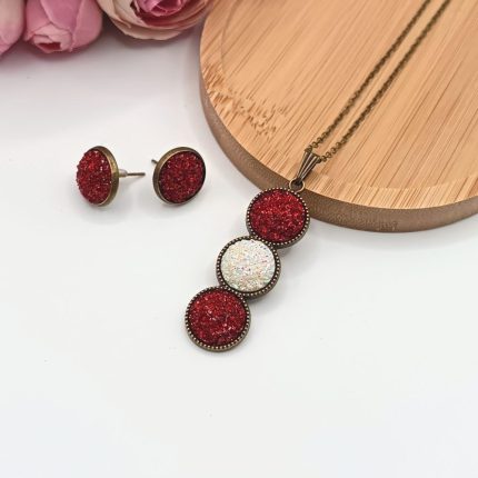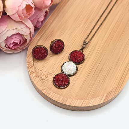 Antik bronz ékszerszett – nyaklánc és fülbevaló piros csillogó textilbőrrel