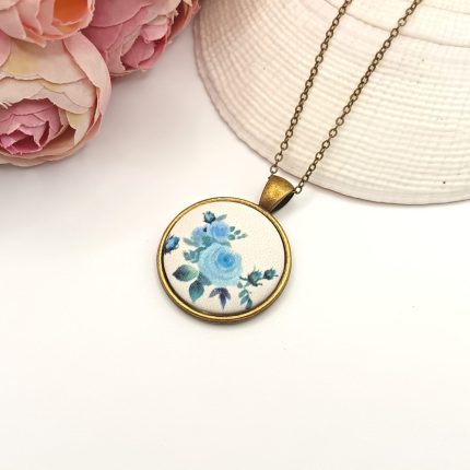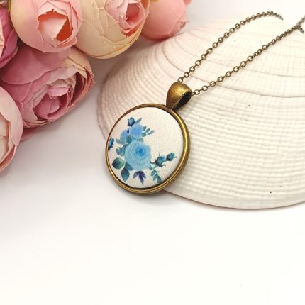 Antik bronz nyaklánc – kék rózsa mintás textillel