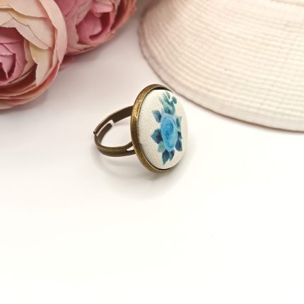 Antik bronz gyűrű – kék rózsa mintás textillel