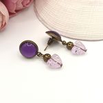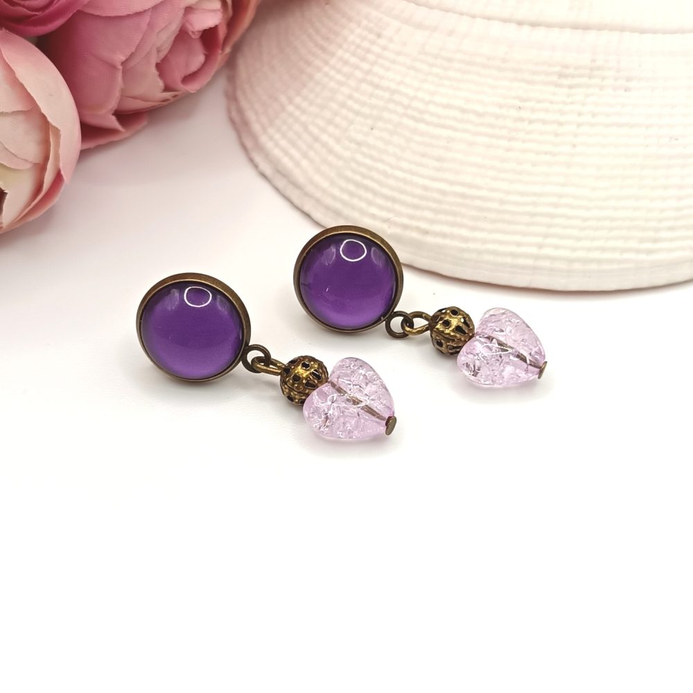 Antik bronz bedugós fülbevaló – lila üveg lencsével és lila roppantott szív gyönggyel