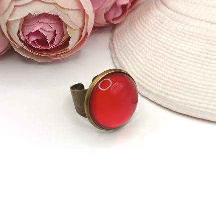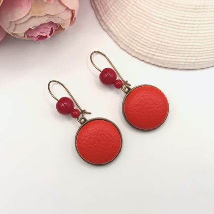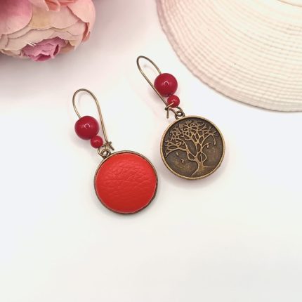 Antik bronz akasztós fülbevaló – piros textilbőr lencsével, piros korallkő ásványgyönggyel