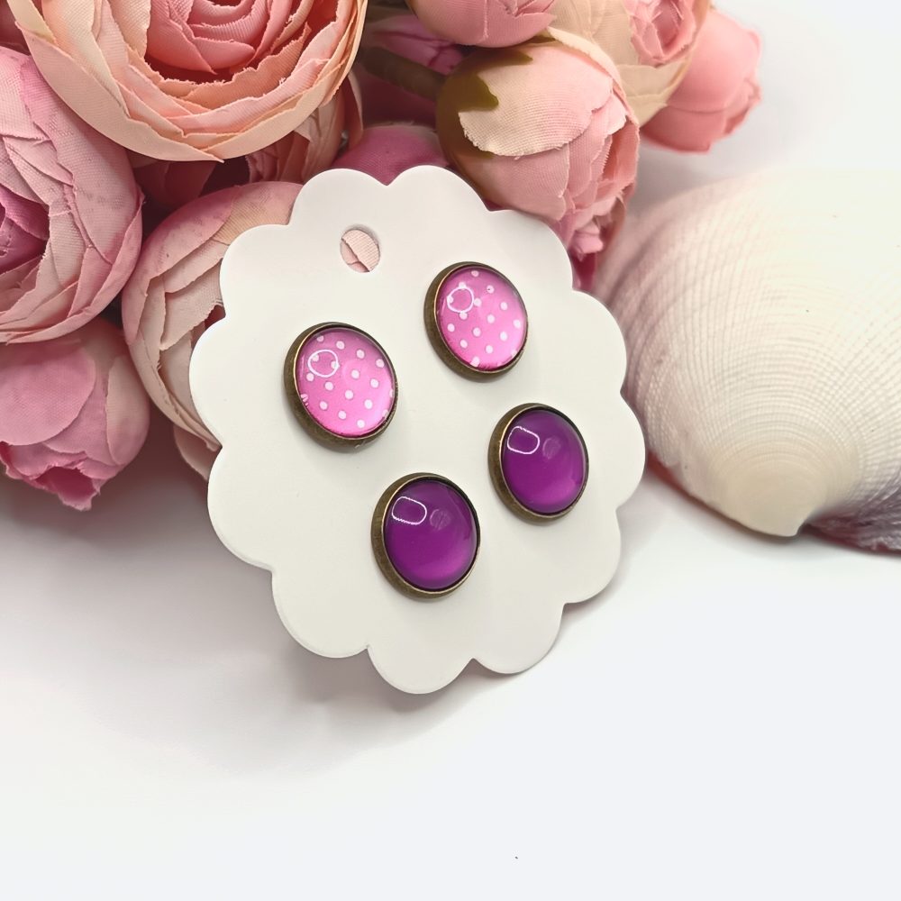 Kezdőlap Fülbevalók Bedugós fülbevaló Páros bedugós fülbevalók Antik bronz bedugós fülbevaló – rózsaszín, fehér pöttyös / pink lencsékkel