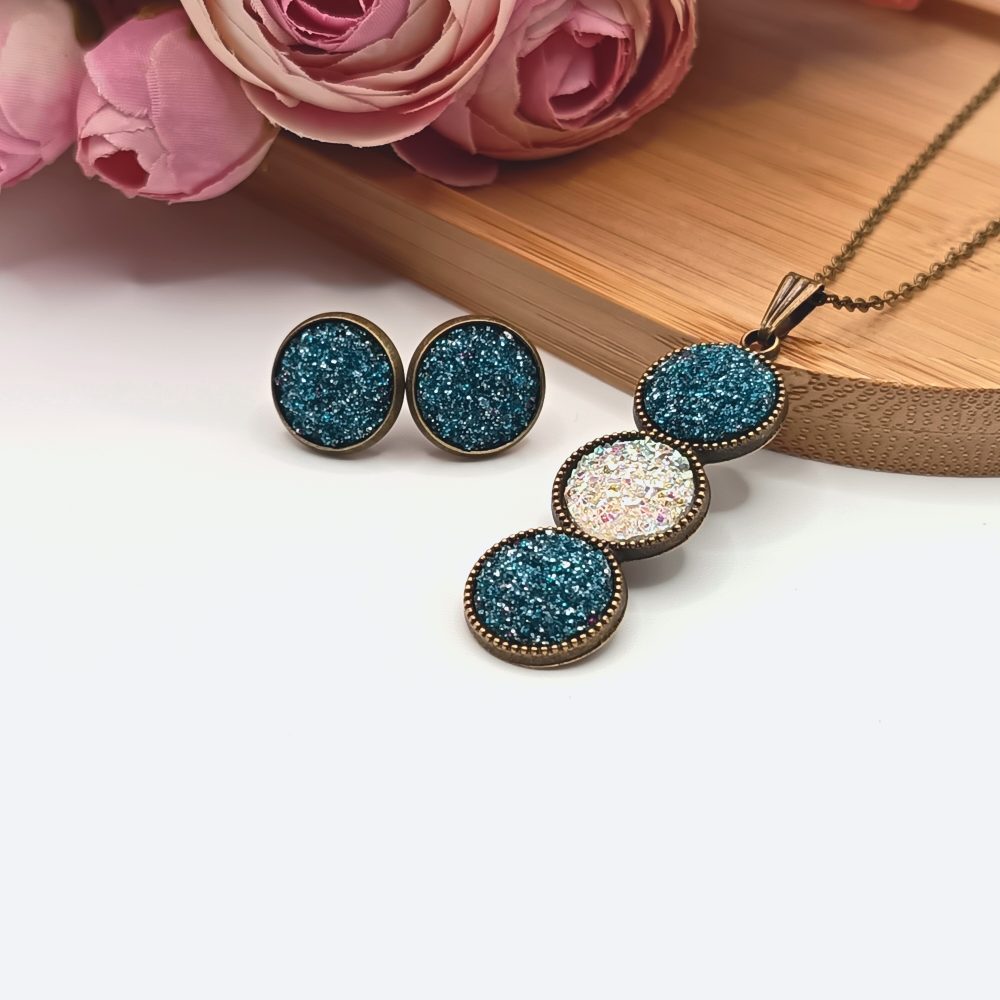 Kezdőlap Szettek Antik bronz ékszerszett – csillogó acélkék / fehér lencsével