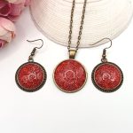 Antik bronz ékszerszett – nyaklánc és fülbevaló piros csillogó textilbőrrel