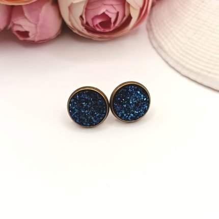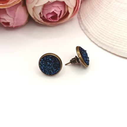 Antik bronz bedugós fülbevaló – csillogó sötétkék lencsével
