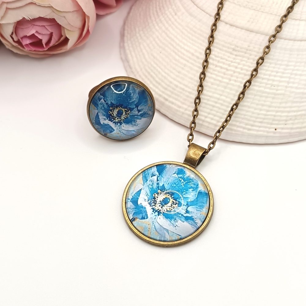 Kezdőlap Szettek Antik bronz ékszerszett – nyaklánc és gyűrű kék virágmintával