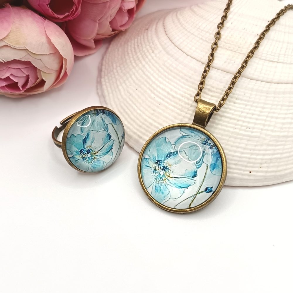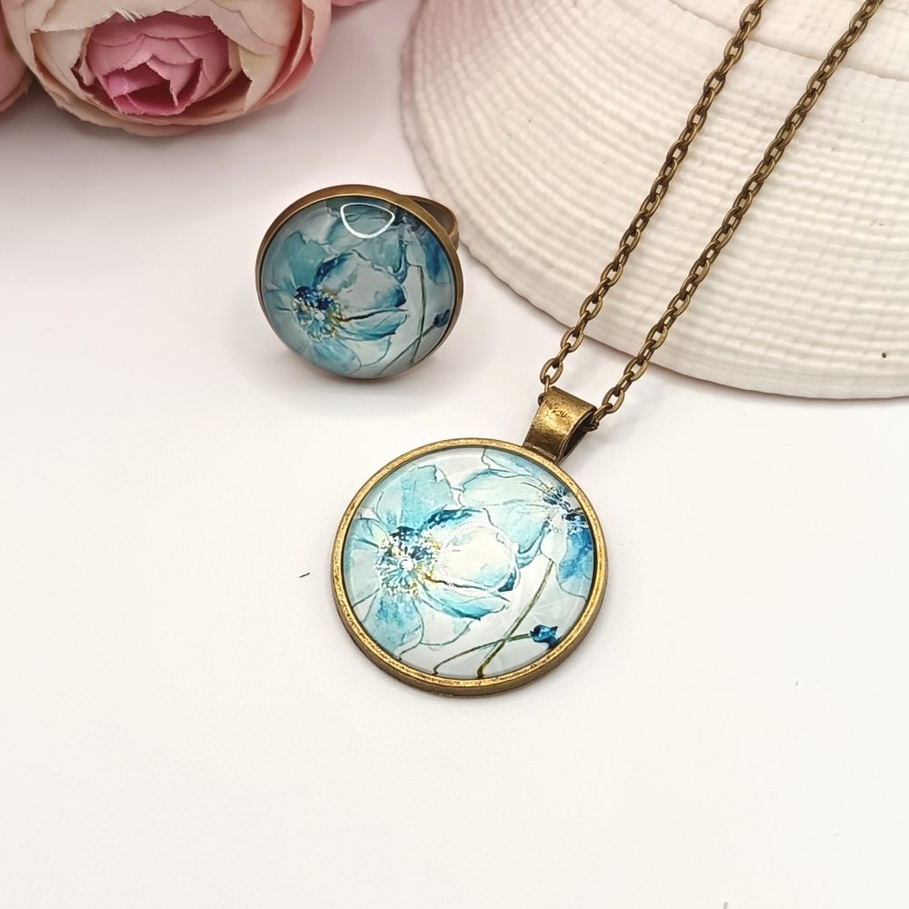 Kezdőlap Szettek Antik bronz ékszerszett – nyaklánc és gyűrű kék virágmintával