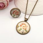 Antik bronz ékszerszett – nyaklánc és fülbevaló rózsaszín/lila/halvány piros virágmintával