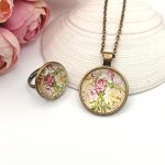 Antik bronz ékszerszett – nyaklánc és fülbevaló rózsaszín/lila/halvány piros virágmintával
