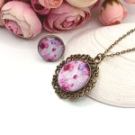 Antik bronz ékszerszett – nyaklánc és fülbevaló rózsaszín/lila/halvány piros virágmintával