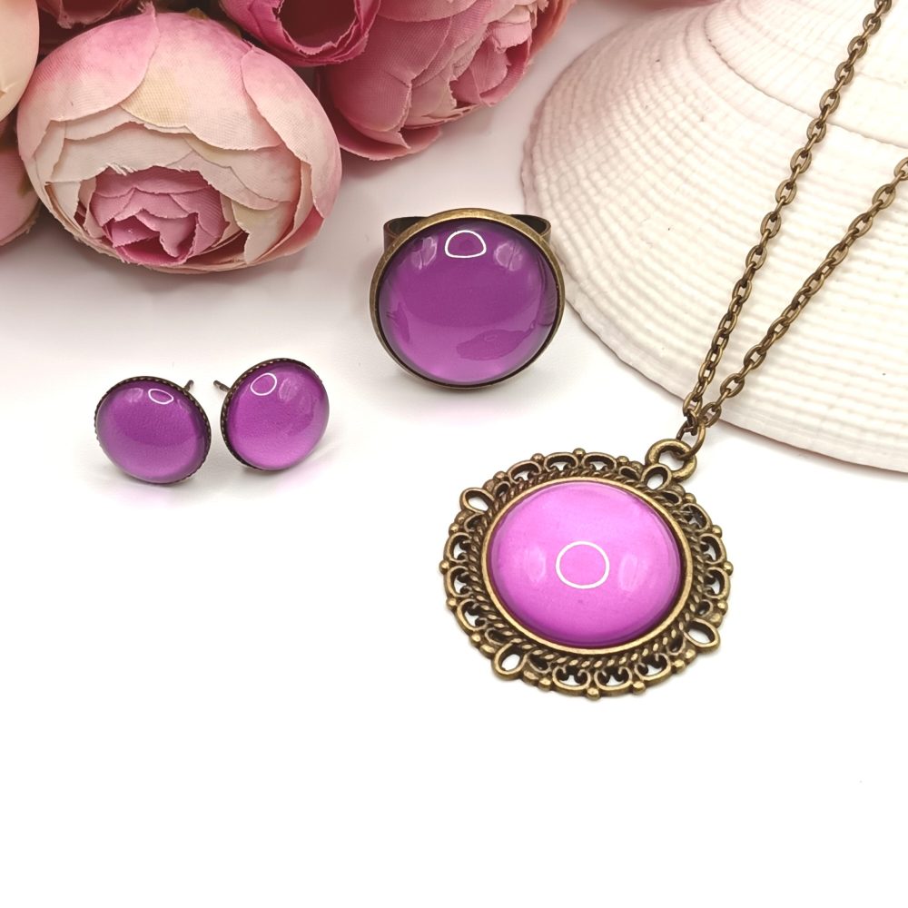 Kezdőlap Szettek Antik bronz ékszerszett – nyaklánc, gyűrű és bedugós fülbevaló pink üveg lencsével