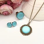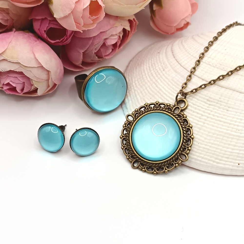 Antik bronz ékszerszett – nyaklánc, gyűrű és bedugós fülbevaló világoskék üveg lencsével