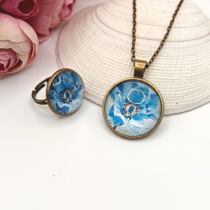 Antik bronz ékszerszett – nyaklánc és gyűrű kék virágmintával