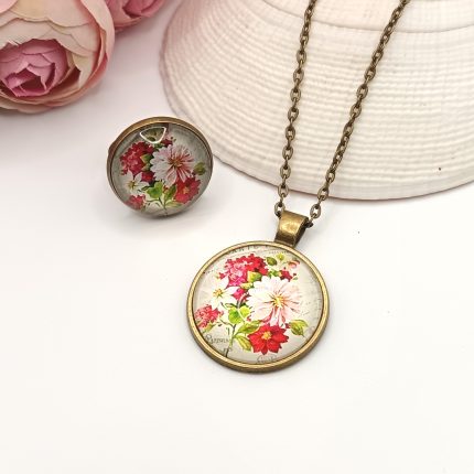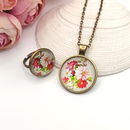 Antik bronz ékszerszett – nyaklánc és gyűrű virágmintával