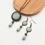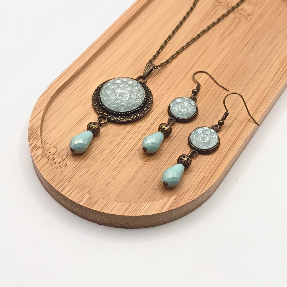 Antik bronz ékszerszett – nyaklánc, gyűrű és bedugós fülbevaló világoskék üveg lencsével