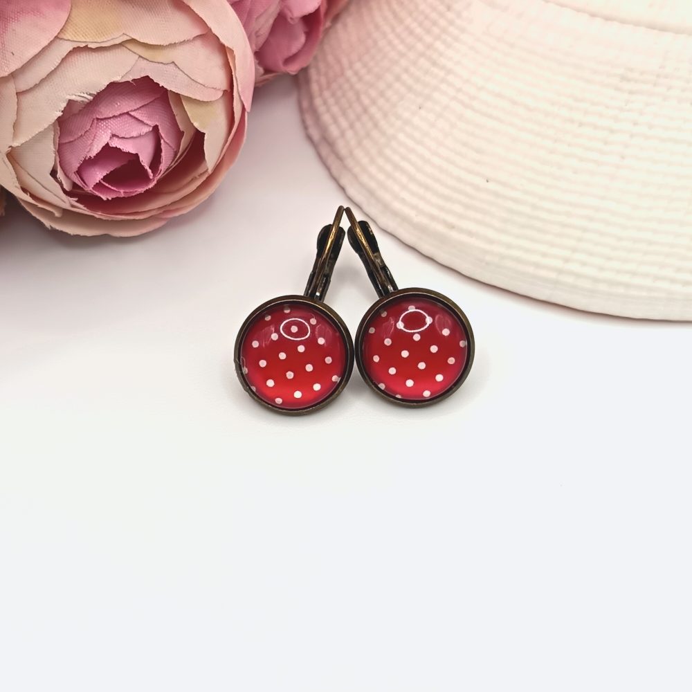 Kezdőlap Fülbevalók Franciakapcsos fülbevaló Antik bronz franciakapcsos fülbevaló – piros, fehér pöttyös lencsével