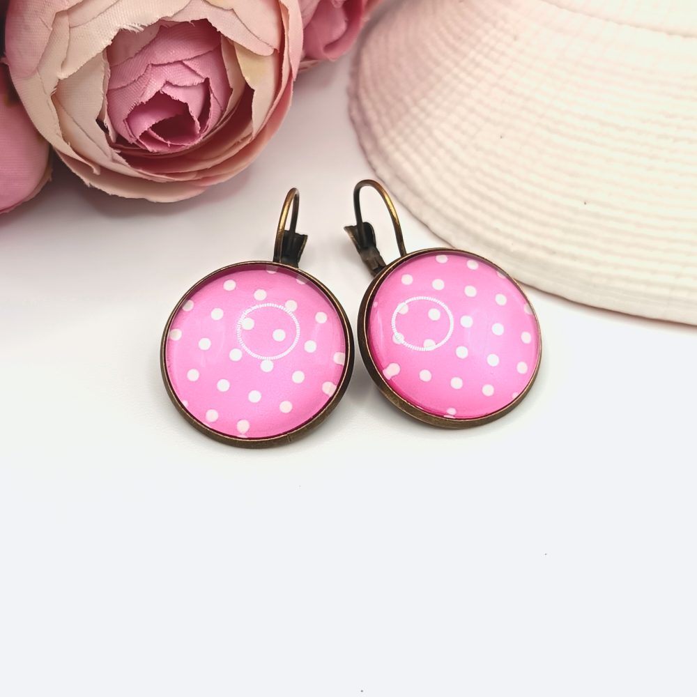Antik bronz franciakapcsos fülbevaló – rózsaszín, fehér pöttyös lencsével