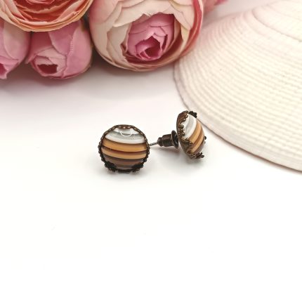 Antik bronz bedugós fülbevaló – fehér / barna csíkos lencsével
