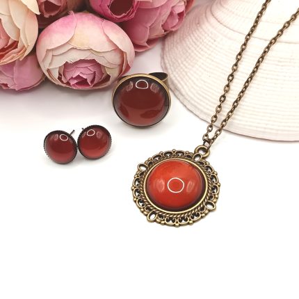 Antik bronz ékszerszett – nyaklánc, gyűrű és bedugós fülbevaló barna üveg lencsével