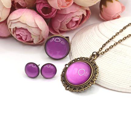 Antik bronz ékszerszett – nyaklánc, gyűrű és bedugós fülbevaló pink üveg lencsével