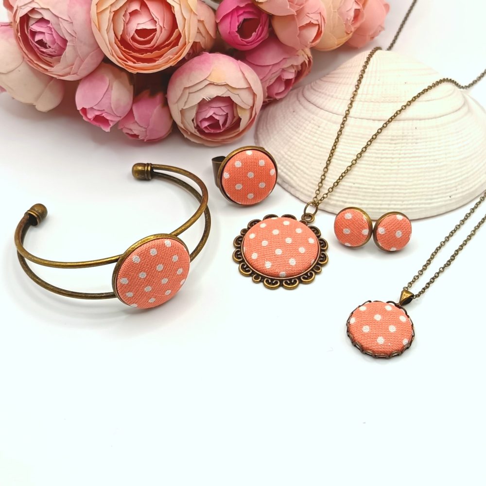 Antik bronz gyűrű – barack, fehér pöttyös textillel