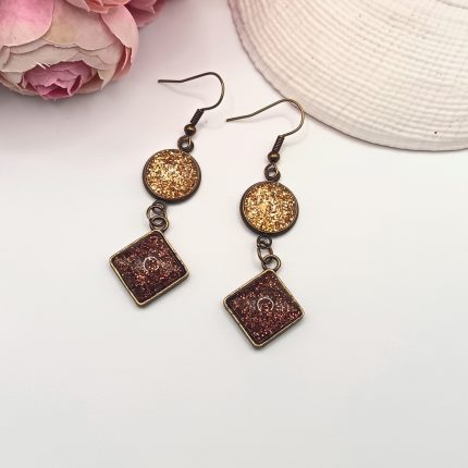 Antik bronz akasztós fülbevaló – antik bronzbarna / antik arany csillogó textilbőrrel