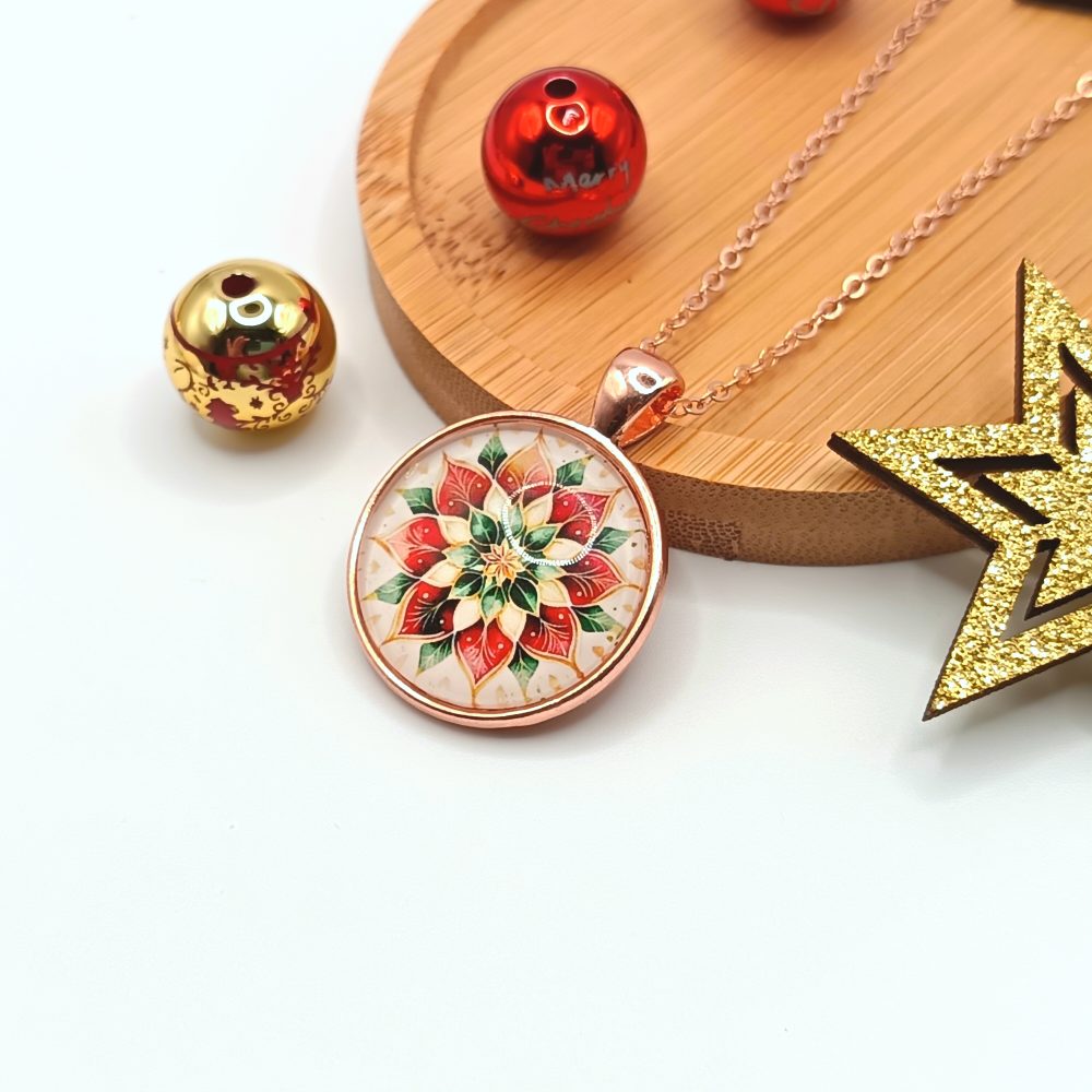 Kezdőlap Nyakláncok Rózsaarany nyaklánc – piros/fehér/zöld mandala mintás lencsével