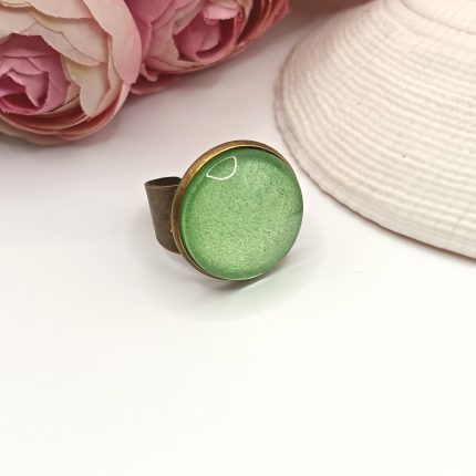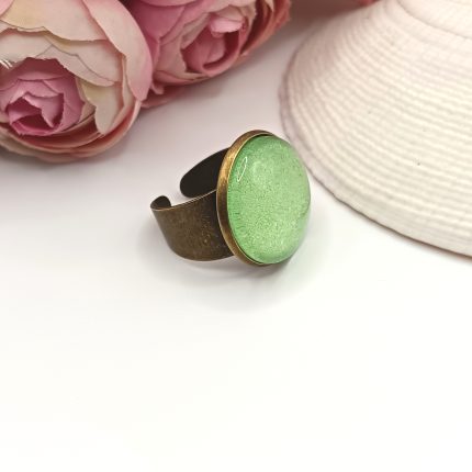 Antik bronz gyűrű – világoszöld csillogó textilbőrrel
