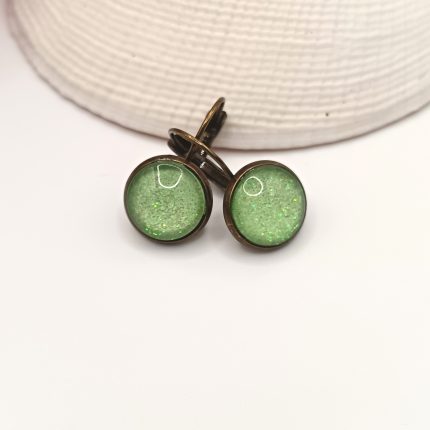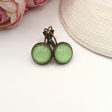 Antik bronz franciakapcsos fülbevaló – világoszöld csillogó textilbőrrel
