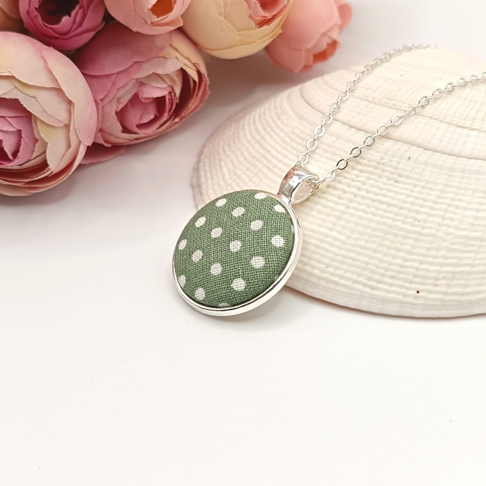 Ezüst nyaklánc – zöld, fehér pöttyös textillel