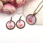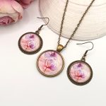 Kezdőlap Szettek Antik bronz ékszerszett – nyaklánc és fülbevaló rózsaszín/lila/halvány piros virágmintával