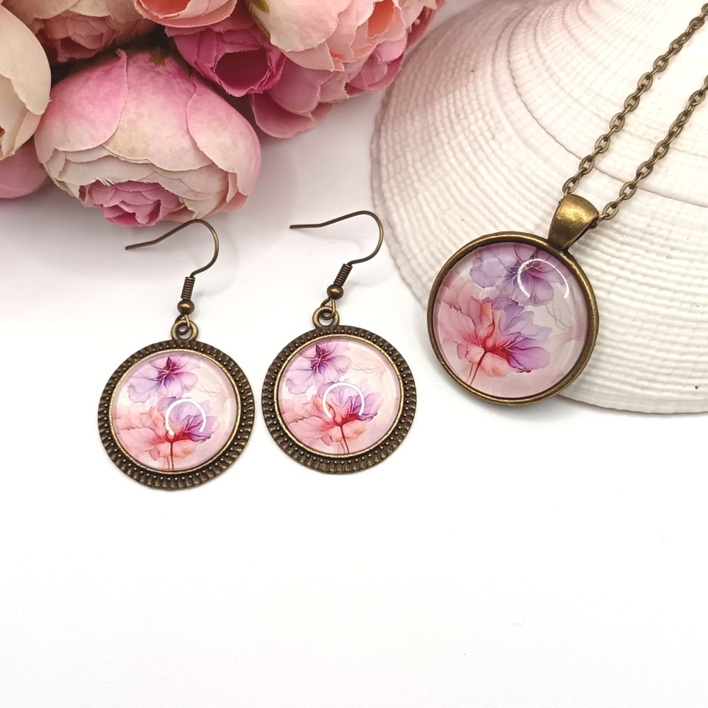 Antik bronz ékszerszett – nyaklánc és fülbevaló rózsaszín/lila/halvány piros virágmintával