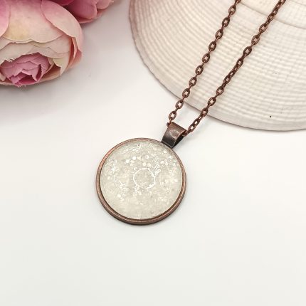 Antik bronz nyaklánc – fehér üveg lencsével és fehér gyönggyel