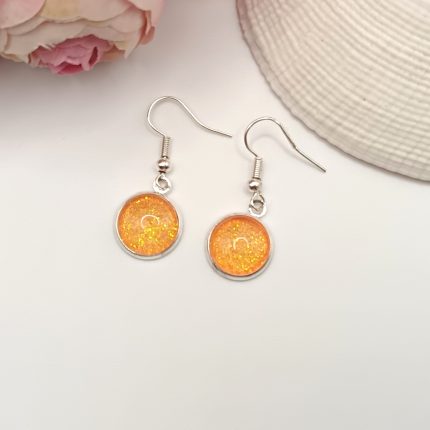 Ezüst akasztós fülbevaló – narancssárga csillogó textilbőrrel 1800 Ft