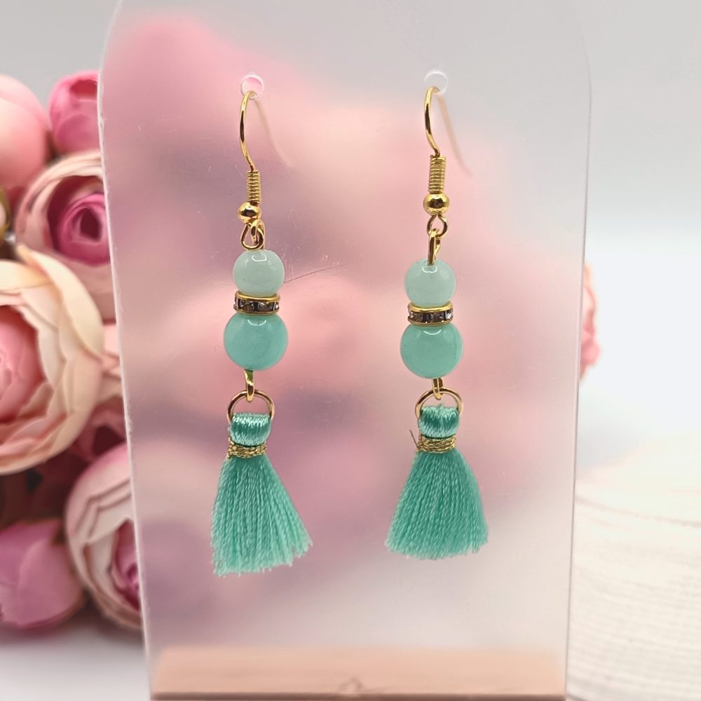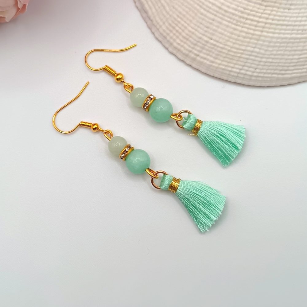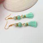 Arany akasztós fülbevaló – amazonit gyönggyel és mentazöld bojttal