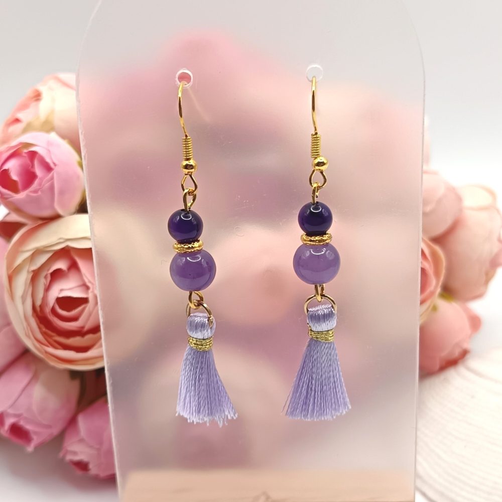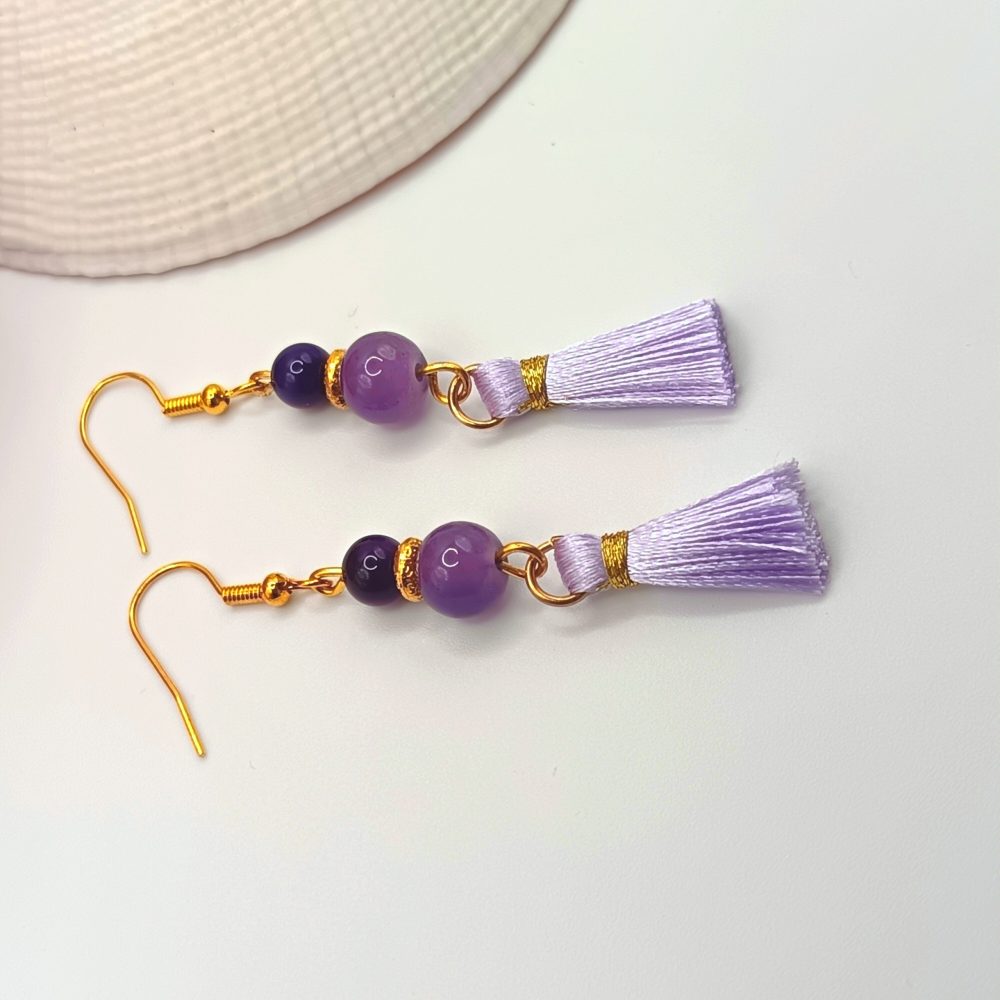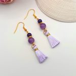 Arany akasztós fülbevaló – ametiszt, lila achát gyönggyel és világoslila bojttal