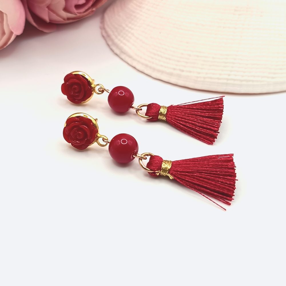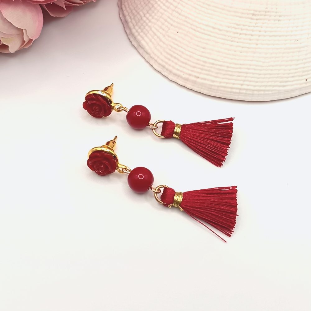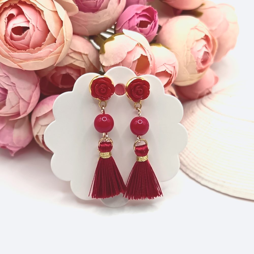 Arany akasztós fülbevaló – bordó rózsával és bojttal