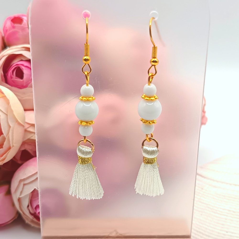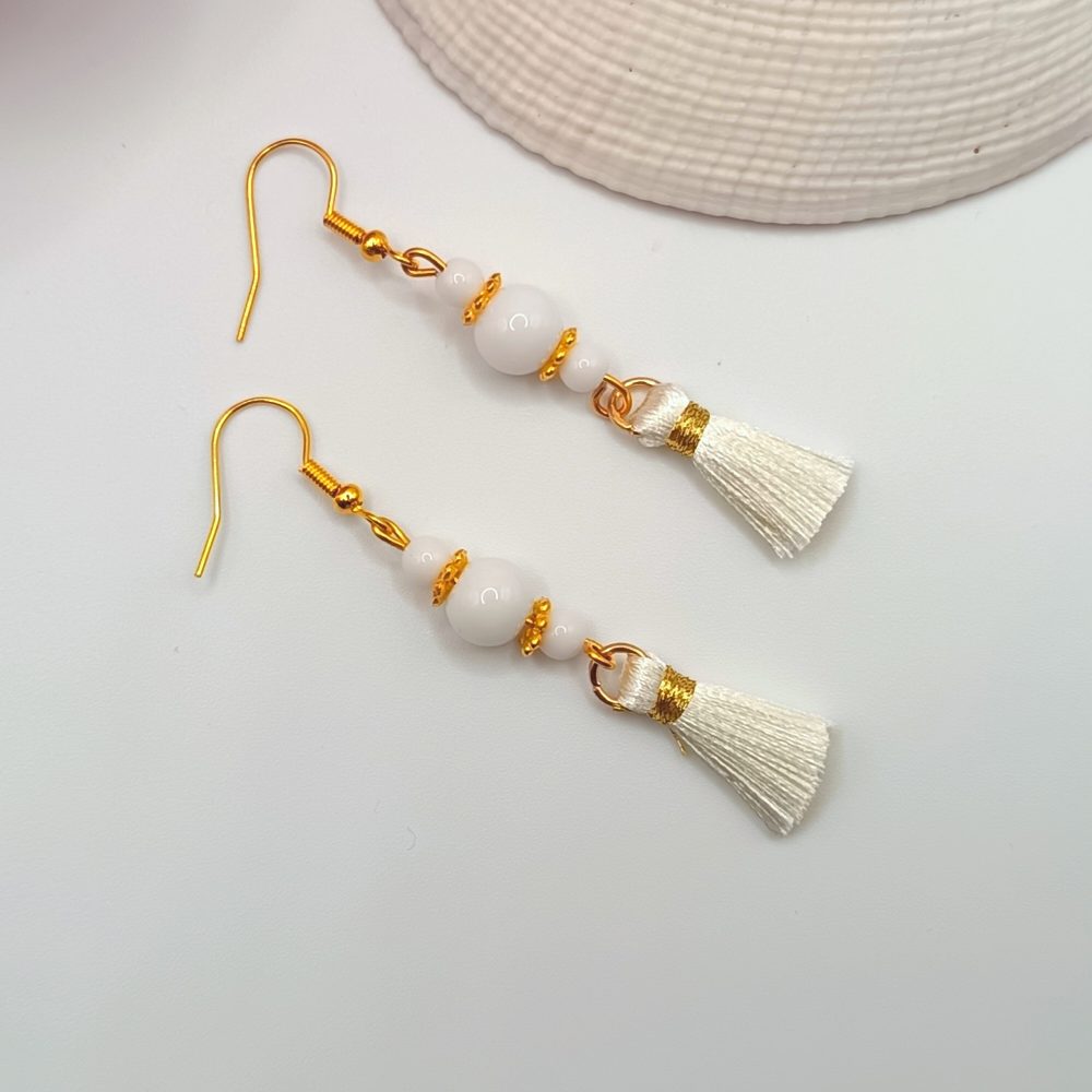 Arany akasztós fülbevaló – fehér achát gyönggyel és krémfehér bojttal