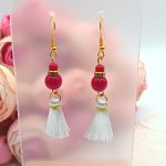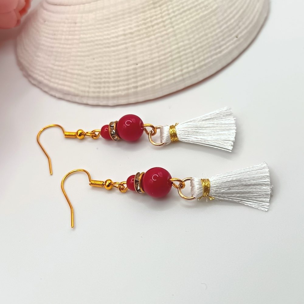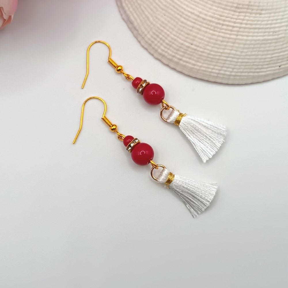 Arany akasztós fülbevaló – piros korallkő gyönggyel, fehér bojttal