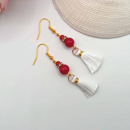 Arany akasztós fülbevaló – piros korallkő gyönggyel, fehér bojttal 2000 Ft