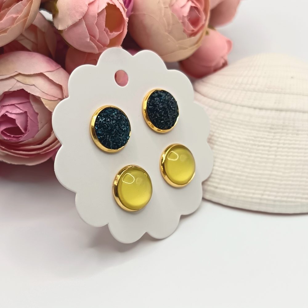 Kezdőlap Fülbevalók Bedugós fülbevaló Páros bedugós fülbevalók Arany bedugós fülbevaló – csillogó sötétkék / sárga lencsékkel